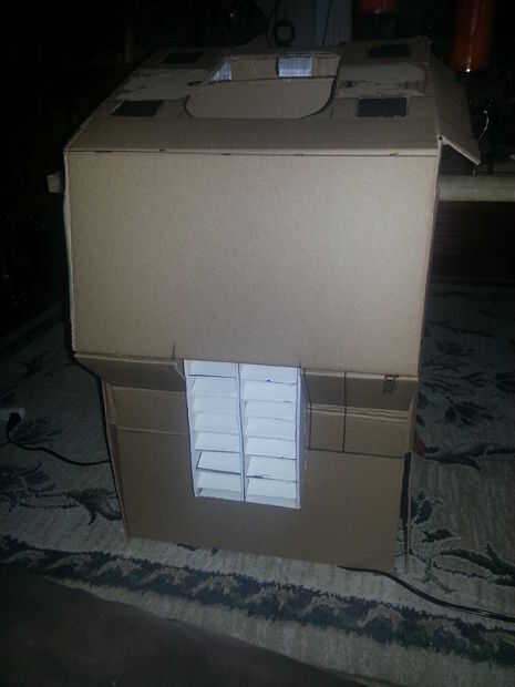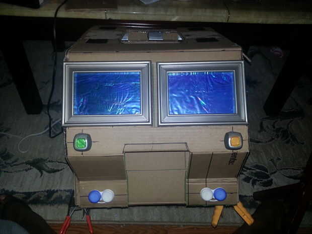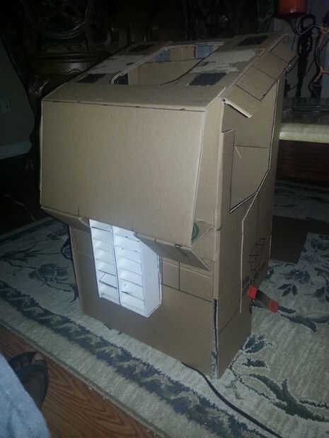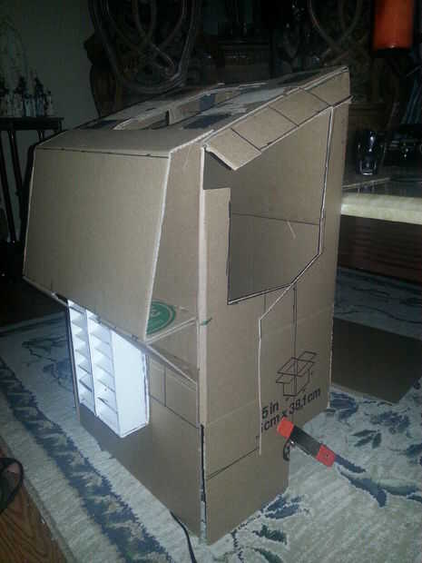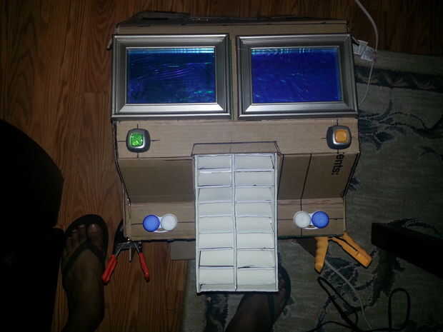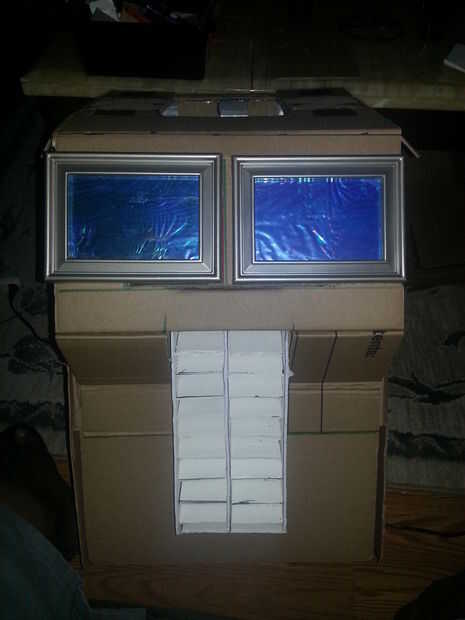 Optimus Prime un traje en 5 días para cerca de $20. Hace sobre todo de un montón de cartón, cajas de cereal, velcro, pegamento caliente y pegamento, entre otras cosas.Sacó a una proyección de medianoche de la venganza de los caídos. Fue una gran expe
