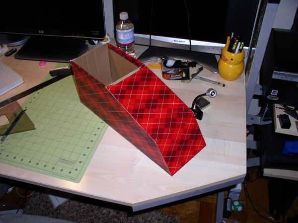 he probado todo tipo de métodos para cubrir las costuras de la cartulina. He intentado spray pegamento y envolviendo el papel para cubrir las costuras, lijar la cinta de embalaje las costuras, pero ninguno de estos métodos funcionó derecho. Lo que encontré para trabajar y ser razonablemente rápido fue primero cubrir todos los bordes de cinta adhesiva de empaque. A continuación, utilizar la imprimación de spray en la cinta. Una vez seca, utilice pintura de casa para ocultar los bordes de la cinta. La pintura le da una textura que ayuda a disimular. Utilicé un rodillo de pintura estándar para darle una textura uniforme. Le di dos capas. Una vez que todos estos estén secos, aplica una capa base de azul y deja seco. Luego apliqué la plata. Luego, utilicé la cinta de enmascarar y pinturas acrílicas añadir todos los efectos de la etiqueta. Para ahorrar dinero, corté la cinta de enmascarar azul en pequeñas tiras con mi x-acto y la regla, puesto que para estarcir, usted no necesita mucho. la menos mejor. Es menos probable que tire hacia arriba y de sus otros detalles pintados.