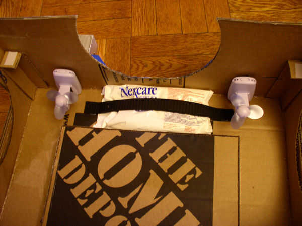 De todos el cartón los trajes que he visto, muy pocos dirección personas cuán caliente puede obtener usando uno de estos. Cartón es un excelente aislante. Esto puede funcionar a tu favor o en contra de usted. Para que funcione para usted, encontrar una manera para mantener la temperatura dentro del fresco traje es crucial y no tan difícil como puede parecer. Un poco va un largo camino. Para mantener la temperatura interior manejable, que usé hielo químico paquetes. No sólo consiguen frescos al instante, pero puede evitar el lío de condensación, y porque está en una caja aislada, las temperaturas más frescas recorrer un largo camino. Además de los paquetes de hielo químicos, tengo dos ventiladores de batería personales que se sujetan con velcro en el interior del traje. El aire frío desde el paquete de hielo Haz recirculado en el traje a través de los ventiladores. Paquete de hielo cuestan $4 y tengo los ventiladores de Amazon.com por $12 un pedazo.