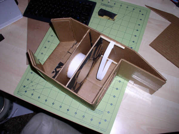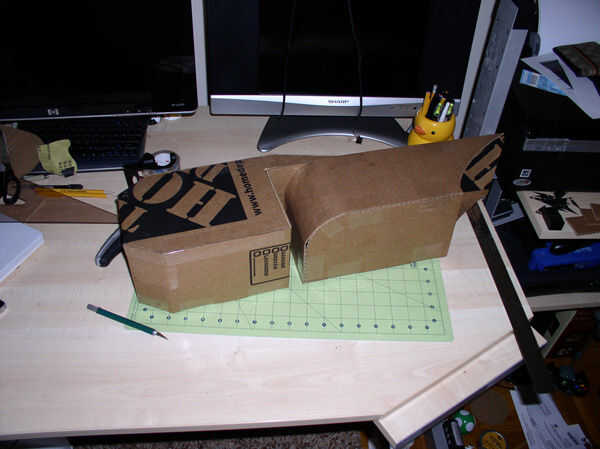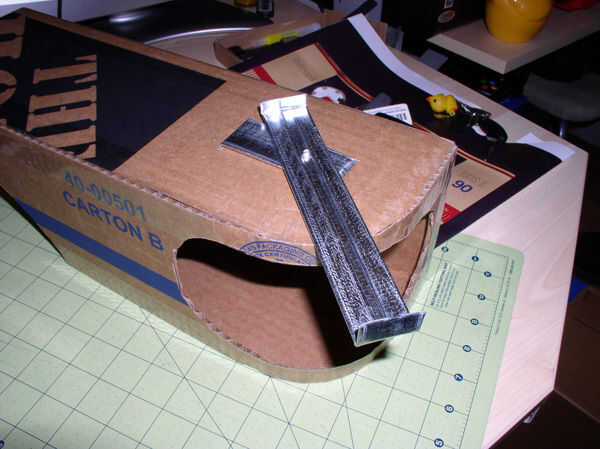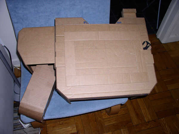 No todo va a planear. La primera versión que construí fue más movimiento en el aspecto de gasto. Fue un hombro separado que después de la prueba, se vería horrible. Así que con la ayuda de dannyeurena y su traje de Optimus Prime, colocar los hombros en el cuerpo era el camino a seguir. Reconstruido los brazos con una nueva bisagra que es menos visible, uno de 1 pulgada galvanizado acero pop remachado juntos. El metal de hoja forma una "Z" para que quede el brazo y antebrazo y es pop remachado en el cartón con una arandela. Pintura era el mismo. Para los extensores que aparecen en las manos en la parte exterior del antebrazo, usé más del pelado apagado técnica cartón. Para las manos, me compré un par de guantes de hockey usado fuera de Ebay.