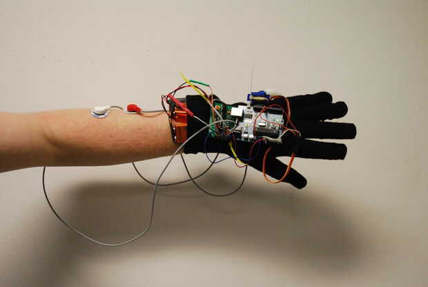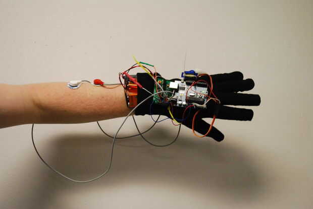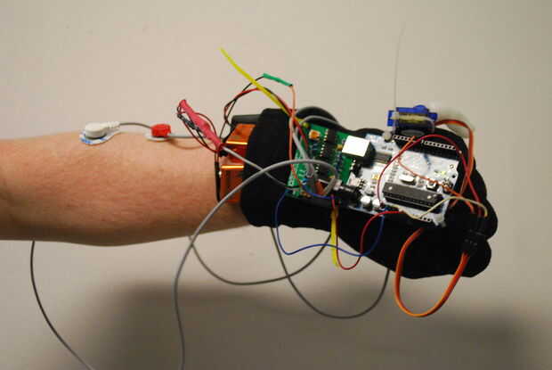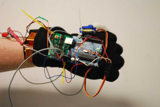 El guante utiliza mi músculo flexiona para reaccionar y mover el motor. Usé la placa de sensor Advancer tecnologías EMG que me dio datos que pude procesar con un arduino. Con esos datos le dijo a arduino para mover un servo cuando flexiona.