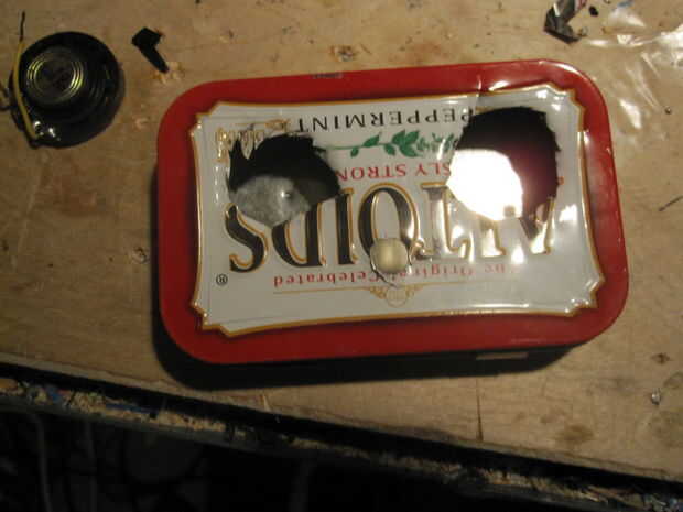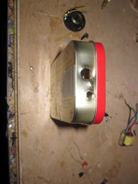 Primero necesita hacer agujeros en la lata altoids (o en otro recinto que vas a utilizar) para los altavoces, conector, interruptor y potenciómetro.