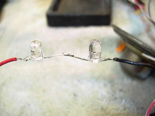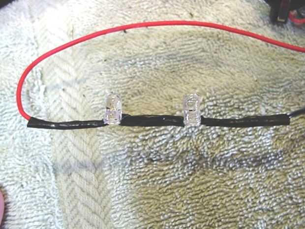 Ahora soldar el cable restante del LED está trabajando con el otro sobre su lado con la punta plana. Están creando un circuito de "serie" por lo que se combinan los dos 3 voltios LED para hacer 6 voltios del circuito puede manejar el poder.