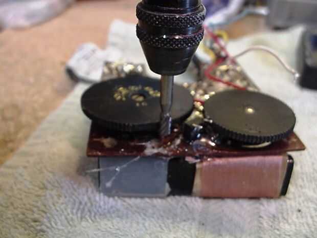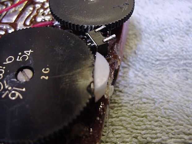 Localice su original marca de lápiz en la ruedita del sintonizador. Con la herramienta rotatoria, aplane el borde de la rueda para que coincida con la media luna roja de nylon.