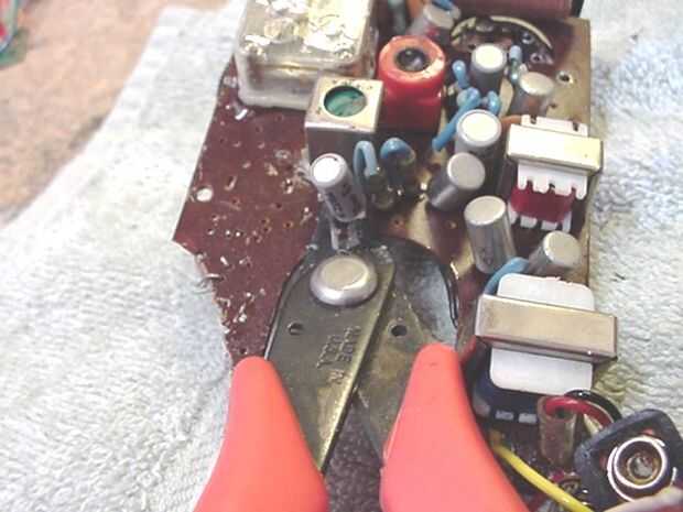 En el circuito de radio original, utilice su cortador de alambre "cortadora" para cortar los cables de los componentes electrónicos en su base para eliminarlos. Esto dejará una superficie plana para pegar sus componentes en.
