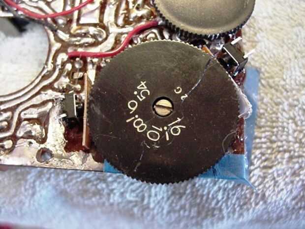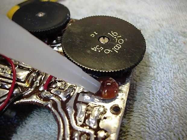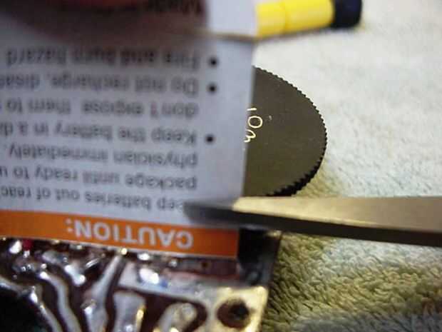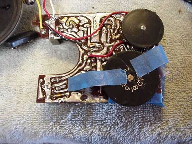 Aplicar el Goop o pegamento Shoe Goo a las áreas en el circuito de tierra plana, a continuación, coloque los interruptores en el pegamento con el lado que tiene el restante conduce hacia arriba. Los botones redondos deben mirar la rueda de sintonización con un trozo de cartón fino entre los dos para crear un pequeño espacio. Utilicé algunas piezas cortadas del embalaje de la batería.