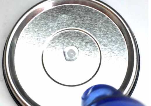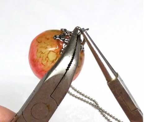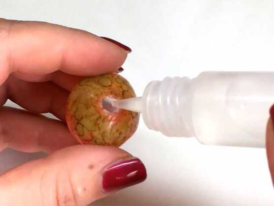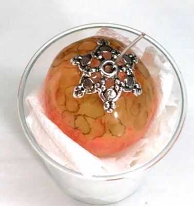 Hacer la parte superior para el talón con una pequeña cantidad de líquido fimo (2 capas). Hacer un agujero en el centro e inserte un alfiler de cabeza.