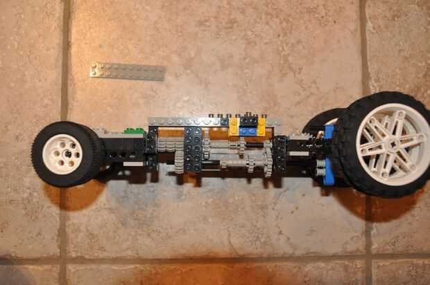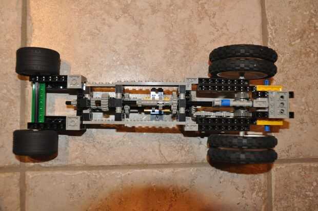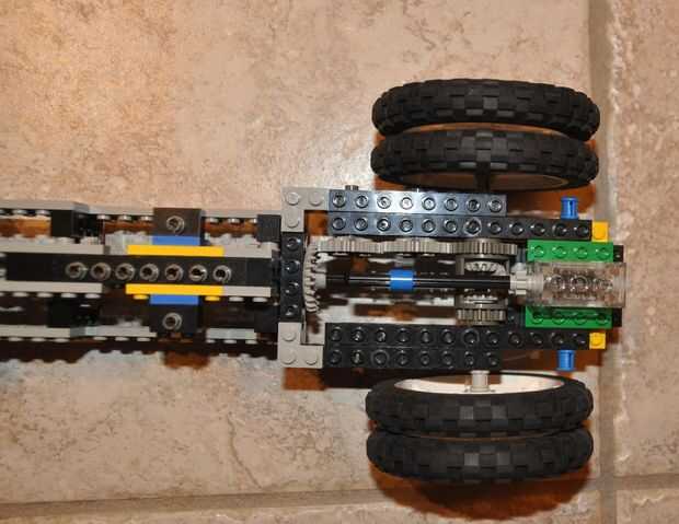 Esta máquina es un tipo de transmisión simple hecho enteramente con Lego. Es capaz de funcionar a tres velocidades diferentes (1:3, 1:1, 3:1). Este modelo es más de un dispositivo de "prueba de concepto" y no incluye ningún motores, sensores o un mecanismo funcional de la dirección. Sin embargo, se podrían ser fácilmente modificado al accommadate varios otros componentes. La forma en que funciona es primera potencia que transmite desde la parte superior del eje al eje de la parte inferior. Esto se hace mediante un sistema de engranaje especial que asegura que los dos ejes se dedican constantemente a lo largo de varias configuraciones de engranaje de la máquina. El eje inferior es capaz de moverse hacia adelante y hacia atrás enganchar el parte superior eje con diferentes engranajes. Este movimiento horizontal se controla mediante un engranaje de estante unido a una caja de engranajes de reducción de engranaje de gusano (un motor se adjunta a la caja de engranajes de reducción en una máquina completa). Las dos secciones de la parte superior del eje no están conectadas, que permite que las secciones giren a velocidades diferentes. La potencia se transmite desde el parte superior eje a las ruedas por un simple sistema de engranajes conectados a una caja de engranajes diferenciada. Si recibo suficientes peticiones, puedo considerar una versión funcional con los motores y el RCX. Sin embargo, me preocupa que los motores de Lego no sería capaces de manejar la tensión del cambio de marchas a altas velocidades.