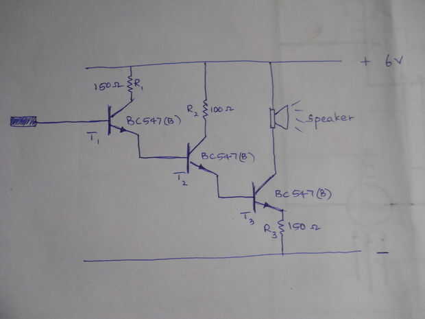 El receptor es incluso más simple que el transmisor. Es sólo un conjunto de tres Transistores conectados entre sí. He utilizado BC 547 transistor que tiene una alta ganancia y es muy barato también. Las resistencias están conectadas a los colectores de T1 y T2 y el emisor de T3. El emisor de T1 está conectado a la base de T2 y el emisor de T2 está conectado a la base de T3. La base de T1 tiene un cable conectado a él que actúa como una almohadilla de contacto. Si tienes dudas o sugerencias con respecto a este circuito no dudes en comentar.