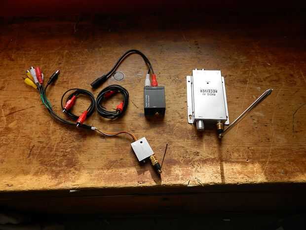 Un vídeo transmisor y receptor. Cuanto menor sea la frecuencia mejor. Estoy usando uno que transmite a 1080 MHz. He comprado el transmisor por cuenta propia como ya tenía un receptor de una cámara inalámbrica que quema porque pensé 30v daría más energía.