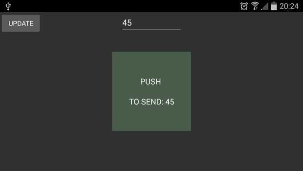 Ahora para comprobar que todo está bien, toque la pantalla verde en android"Push para enviar 125". Si enciende el led en el pin 13 de arduinos, que todo es bueno para ir.