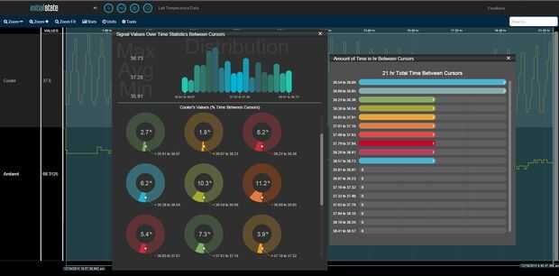 Hay más juguetes para jugar con en tu página de registro. Con una de sus formas de onda seleccionadas, haga clic en el botón "Estadísticas". La izquierda es un histograma detallado de todos los datos del refrigerador así como algunos valores estadísticos básicos. Aquí podemos ver los valores máximos, mínimos y promedio. Mientras que la media es 37,28 grados, el histograma nos indica también los valores 36.54 a 36.69 ocurren con mayor frecuencia – esta medida se llama el "modo". La tabla a la derecha también refleja los datos de modo.