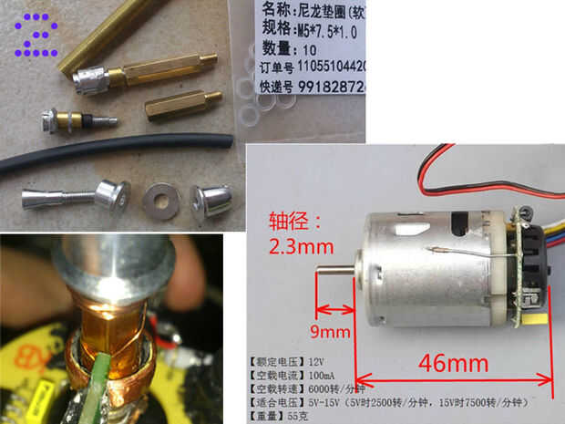 Descripción: La primera es utilizar el "motor de doble eje" más pilares de M3, con tornillos pequeños (más firmemente en el motor del eje desgaste un poco). Pilares bajo el cepillo para poner el anillo de cobre amarillo femenino, se pule y luego añadir el aislamiento de la tubería del encogimiento del calor. Pero el diámetro del eje del motor es 2.3mm y M pilares de diámetro es de 3mm, mientras que también agrega un cobre fino puede total menos concéntrico...