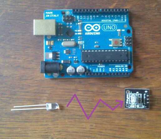 Así, recuerdo que tengo en mi stock un receptor IR con un pequeño control remoto. También tuve un IR llevado. Después de algunas investigaciones en la web para bibliotecas, usé uno ya existente para crear un pequeño y fácil IR protocolo para enviar datos entre mis dos tarjetas.