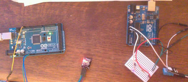 Aquí estamos, una solución simple para enviar datos de mono-direccional entre dos tarjetas Arduino. Por supuesto, soluciones inalámbricas reales (módulos de 433 MHz, Bluetooth o Wifi) también son adecuadas. En mi caso, el módulo IR estaba en stock, y es posible utilizarlo (ningún obstáculo entre ellos). Si usted necesita simplemente enviar datos (a baja velocidad), recuerde los buena vieja transmisores de infrarrojos... Su es posible mejorar este código, por ejemplo mediante la adición de un error de control, o mediante la adición de enlaces bidireccionales.