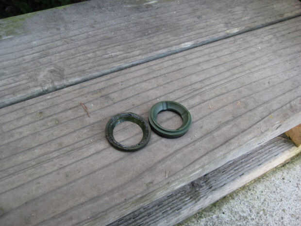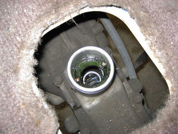 Quite el viejo asiento. Hay un sello de goma por debajo de ella. Retire esto así. El nuevo asiento viene con un nuevo sello de todos modos. Tenga cuidado de no entrar cualquier bits desmenuzadas del asiento de la transmisión. Probablemente no el fin del mundo si lo haces ya que son generalmente suaves. Usé un vacío para extraer los bits.