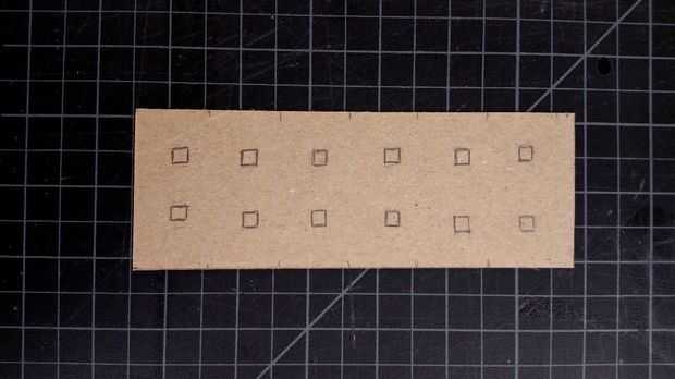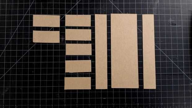 Antes de que podemos cablear los LEDs, necesitamos saber donde van a quedar en la pantalla. La configuración es que los LEDs se sientan en una caja de cartón que está en dentro de la caja de madera. Por lo tanto, empezar por cortar las piezas de cartón. Necesitarás un 2 "x 6,03" pieza, dos de 1 "x 6,03" siete más trozos algo más pequeños que 2 "x 1" y (estas son las piezas horizontales que Irán en el interior de la caja y sus dimensiones exactas dependen de cómo grueso su cartón es). Las dimensiones de la caja deben ser de 2 "x 1" x 6.03 ". (** Nota que esta dimensiones no se alinean perfectamente con lo que se muestra en las fotos. Las dimensiones de la foto son imprecisas y se editó).