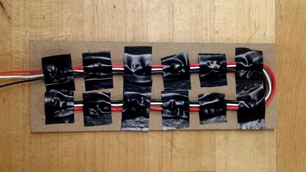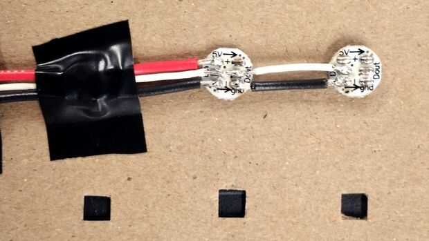En el 2 "x 6,03" pieza de aglomerado, lay out donde debe ir el LED. Cada corte horizontal de la barra de pantalla tendrá 2 LEDS, por lo que debe tener 6 hileras de 2 LEDs espaciados uniformemente. No tiene que ser perfecto, pero pretende colocarlos como se muestra en la imagen de arriba. Cortar rectángulos pequeños sólo lo suficientemente grandes como para adaptarse a su NeoPixels (aproximadamente. 19" Plaza). Con la instalación de LEDs en este esquema, usted puede soldarlos juntos. Primero asegúrese de que los NeoPixels están apuntando en la dirección correcta. Esto significa que en la columna de la izquierda que todas las flechas en los LEDs, conviene, entonces en la columna de la derecha que todas las flechas deben estar apuntando hacia abajo. Ahora, de la soldadura junto 5V, GND y Din/duda sobre cada píxel consecutivo, como se muestra. Para la estabilidad adicional, puede cinta los LEDs sobre el cartón. Asegúrese de dejar suficiente longitud en los conductores en el primer píxel para conectar a la ONU.