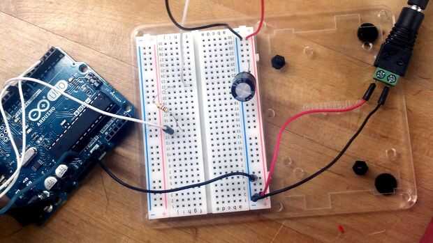 Para probar, utilizar el protoboard y el circuito que se muestra en las imágenes de instalación. Conecte la línea de estruendo de la NeoPixels al pin 9 a través de su resistencia (entre 300 y 500 Ohms). Luego conecte el condensador entre 5V y GND los plomos de la NeoPixels. También conéctelas a los extremos positivos y negativos de la toma del poder femenino. Finalmente Conecte una línea entre esta tierra y la tierra en la ONU. De energía, enchufe primero en 5V fuente de alimentación a la toma de corriente conectada a la NeoPixels, luego enchufe en UNO al ordenador. Usted puede utilizar el código de ejemplo de Arduino ejemplos > Adafruit > NeoPixels > Simple. Asegúrese de especificar que usted está usando pin 9 en la FLORA y que tiene 12 píxeles.