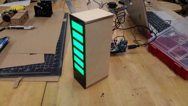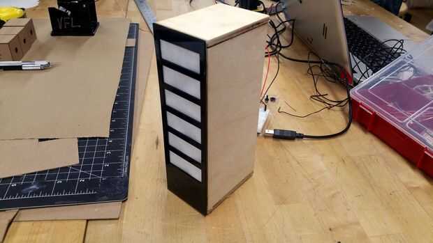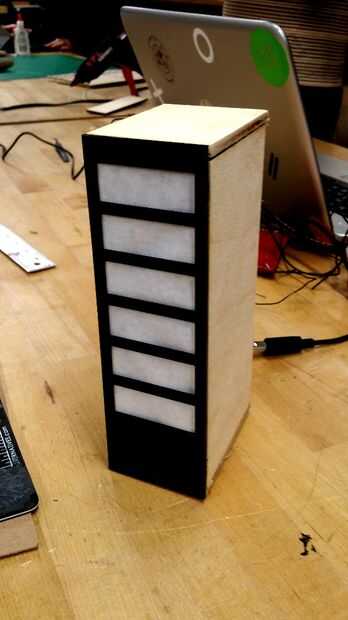 Ahora es el momento para láser corte el resto de las piezas. Utilizar los archivos de illustrator adjunto a cortar las piezas de madera y acrílico. Luego pegan la madera y el acrílico como se muestra. (** Nota hay dos piezas en el archivo de acrílico. La segunda pieza es la base para la banda usable. Se puede establecer esto a un lado hasta el paso siguiente). Finalmente Deslice la caja de cartón en la caja de madera, asegurándose de alinear los LEDs con los recortes rectangulares de acylic frente. Deben caber cómodamente en la caja de madera y permanecer en su propio, pero use pegamento o cinta si es necesario.