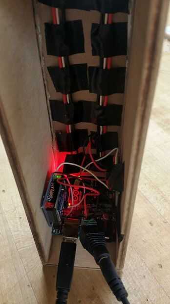 En este punto, si usted no lo ha hecho, puede consolidar todos los circuitos protoboard para la ONU a un solo soldado protoboard. Esto tendrá el LED del circuito que se muestra en el paso anterior, así como los 5V de lo XBee. A continuación, deslice la ONU, XBee y protoboard en la caja. Puede utilizar cinta aislante para sujetarlos. Asegúrese de colocar al enchufe de poder puerto y mujer de UNO en un lugar donde que se pueden acceder fácilmente cuando esté listo para conectar.