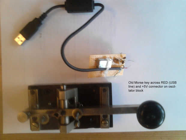 La línea roja desde el cable USB va en la cresta central de la llave, y el canto frontal de la llave se conectará al bloque oscilador marcado + 5v.