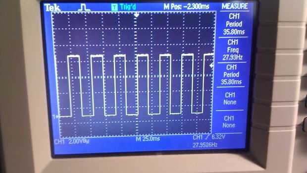 Al probar, probar independientemente cada circuito 555. En primer lugar confirmar que los 555s están recibiendo energía. Luego Compruebe si U$ 1 es salida de un pulso: Si no tienes un osciloscopio puede comprobarlo colocando un LED en serie con una resistencia entre el pin 3 de U$ 1 y GND. Si tiene un osciloscopio, colocar la sonda en el pin 3 y ajustar el potenciómetro para que el periodo es de 36 mS. Compruebe U$ 2 semejantemente.