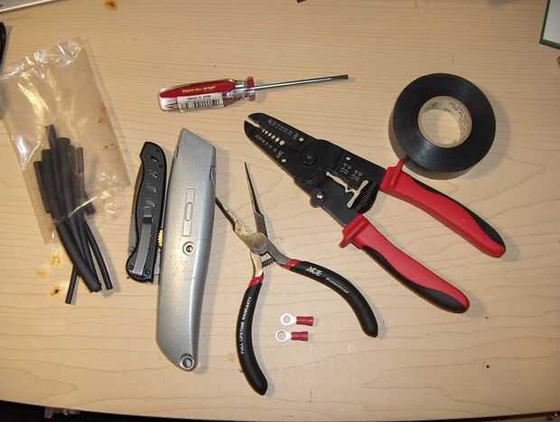 Una cuchilla afilada, sus favorito cortacables, un accesorio para meter y la insistencia, tiempo needelnose alicates y alguna cinta aislante; tal vez algunos tubo termo retráctil para hacer bonito, ya sabes, si es lo tuyo. bonita...