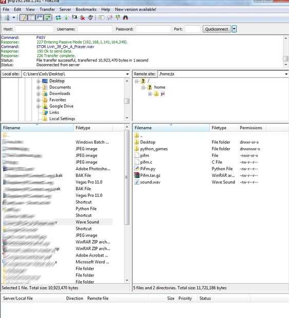 Para importar su servidor solamente use un FTP de canción como Fillzilla, usted puede encontrar un tutorial bastante bueno sobre ella aquí. Asegúrese de que usted importa al directorio home/pi (es en él de manera predeterminada) para evitar el trabajo extra. En cuanto al código sólo reemplazar el 'sound.wav' con el nombre de tu canción.