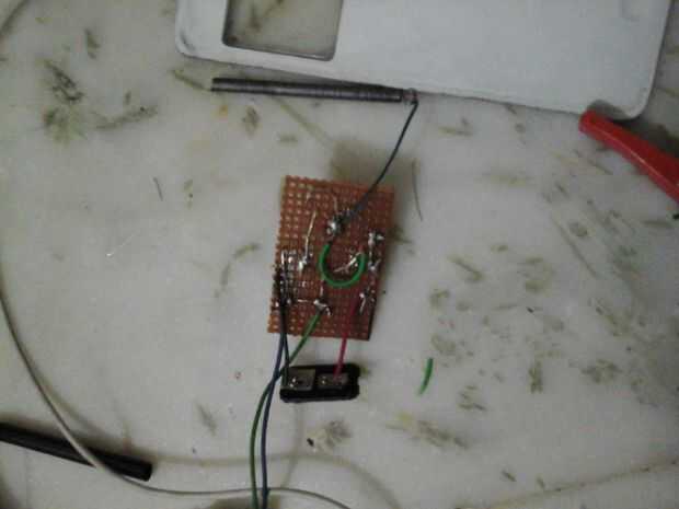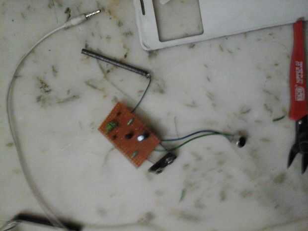 ahora su transistor y su base al terminal positivo de la mic electret de soldadura y soldadura hay una k 4,7 ohm resistor y terminal positivo del capasitor de 1uf a ese mismo cruce ahora soldar cualquier terminal del capasitor de 33 pf a la resistencia de ohmios k 4.7 y el otro extremo del capasitor para el colector del transisitor de la soldadura de los extremos del inductor la 33pf capasitor y otro al colector del transisitor ahora Suelde el cable de la antena con el colector del transisitor ahora soldadura terminal positivo del capasitor de 10 pf al colector del transisitor y su terminal negativo al emisor del transistor, ahora el otro extremo de la soldadura de la 1 uf capasitor al terminal negativo de la mic electret soldar una resistencia de 330 ohm al colector del transisitor y el otro extremo de la resistencia a la terminal negativa de la electret MIC y finalmente soldar el polo negativo de la tapa de la batería al terminal negativo de la mic electret.