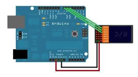 El receptor puede verse como un tablero con los pernos que se encuentran en una formación de 3 columnas con el número de filas con muchos canales más uno. Usted puede pensar las columnas medianas y derecha como carriles de la energía en un protoboard porque proporcionan 5V y tierra en cada fila. Mientras tanto la columna de la izquierda es el valor digital desde el transmisor. Conectarse a Arduino sólo potencia el receptor con los 5V y la tierra y conectar los pines del receptor a los pines digitales del Arduino. El siguiente diagrama es cómo conectar la manera correcta.