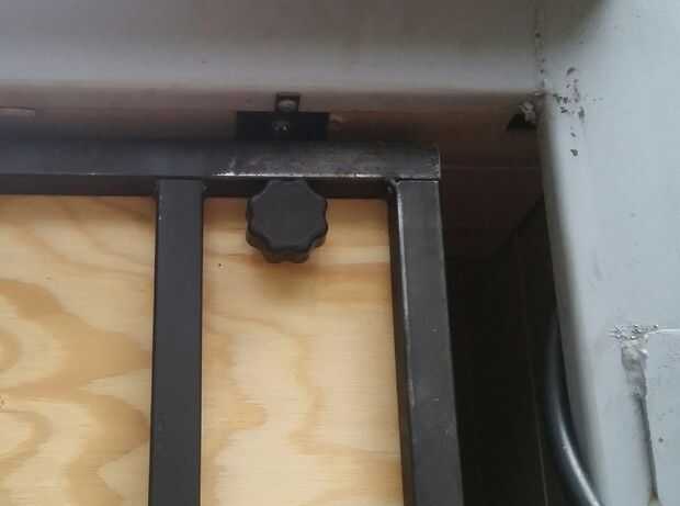 La rampa tenía que fijarse mientras camino por lo que se vieron algunas opciones. Nos decidimos por un tipo de tornillo del sujetador que creó una abrazadera que esencialmente exprime la rampa entre el tornillo de la manija y el soporte en L roscado con una tuerca soldada en la parte posterior.