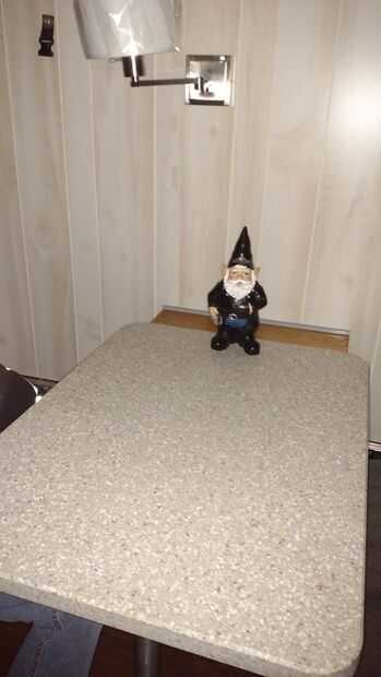 La mesa se hace del mismo material de corian utilizado para la encimera. es grande y tal vez demasiado pesado pero funciona muy bien. Para resolver la cuestión de la edad antigua de la ondulación de la mesa hemos añadido un canal de metal unido a la pared. Una tabla que empareja los gabinetes encaja perfectamente dentro del canal y une a la mesa a la pared con un soporte. Estabiliza la mesa cuando está en uso y se retira fácilmente cuando es el momento de colocar la cama. Agregar fotos luego se descomponen. Las piernas fueron compradas del mundo de camping por unos 45.00. queríamos algo ligero ajuste las patas y estas estaban pre ajuste con el tornillo en la base, así que tomamos el camino más fácil hacia fuera. He encontrado otra idea en línea donde un chico compró una pequeña mesa de plástico y anillos en D ha añadido debajo de la mesa. Straped abajo la tabla con cuerdas de bungie. Pensé que fue brillante pero necesito algo más estable para nuestro uso.