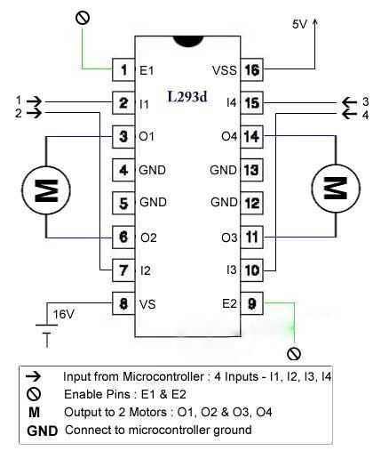 L293D contiene dos circuitos, driver puente H incorporados. En su modo común de la operación, dos motores de corriente continua pueden conducir al mismo tiempo, tanto en dirección hacia adelante y hacia atrás . Las operaciones de motor de dos motores pueden controlarse por entrada lógica en pins 2, 7, 10 y 15. Entrada lógica 00 o 11 detendrá el motor correspondiente. Lógica 01 y 10 gire en el sentido horario y antihorario respectivamente.