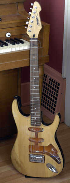'Strat' y 'Stratocaster' son marcas registradas de Fender. Este Peavey es 'Strat-como,' aunque Peavey y Fender pueden ser insultado por la referencia.