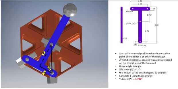 Este mecanismo consiste en una base con dos ranuras que se intersecan en ángulo recto. Dos deslizadores están confinadas dentro de las ranuras y están sujetas a un mango con pernos (tornillos) en posiciones fijas a lo largo de la manija. El mecanismo