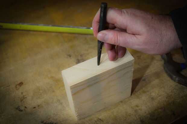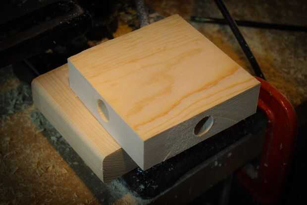 Marca de centros para los agujeros en los lados de los bloques. Use un 13/16" broca para perforar los agujeros en la base. Dependiendo de su viaje de taladro de columna y la longitud de la broca, los agujeros de perforación podría tomar unos pasos. Mi taladro de gama baja sólo tiene un recorrido de dos pulgadas. Usé bloques para ampliar la profundidad - ver video. También tuve que perforar desde ambos lados. Tómese su tiempo midiendo ambos lados ya que esto debe ser un paso suave.