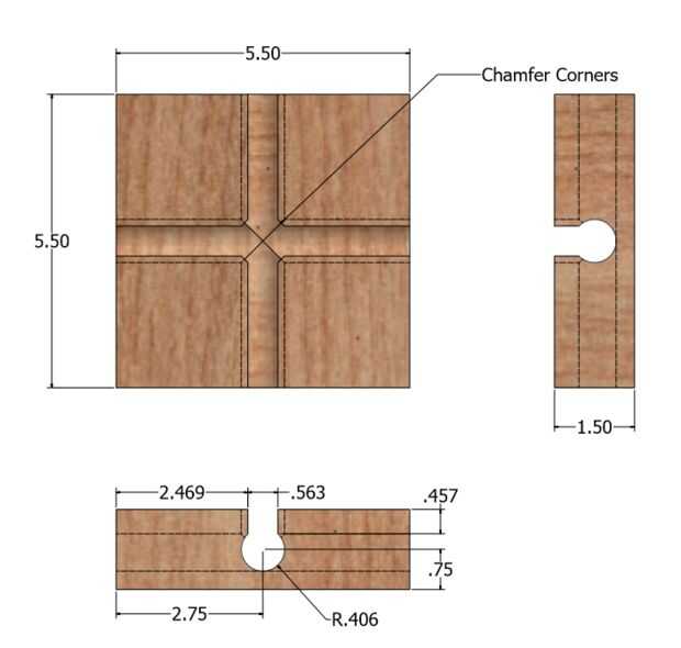 La ranura se cortó con una sierra de mesa. Marque las ubicaciones de las ranuras cruzadas como se muestra en el dibujo. Ajustar la altura de la lámina ~ 3/4". Hacer dos pasos para quitar el material de la ranura. Gire la parte y la segunda ranura de corte. Para permitir la operación más suave, coloque un ligero bisel en los cuatro ángulos interiores. Lo hice con una lima escofina de madera aunque se trabajará el papel de lija.