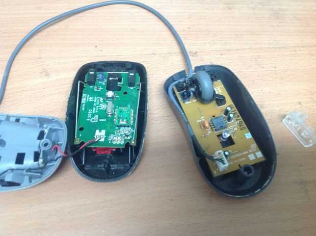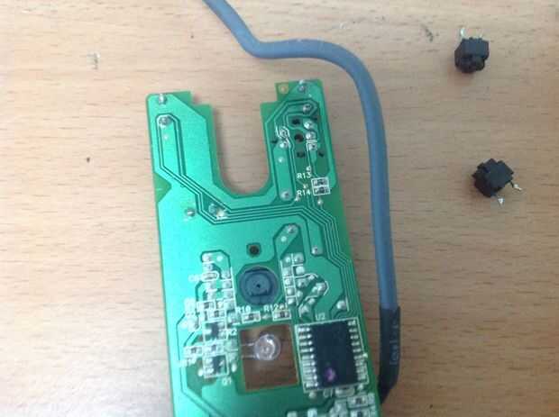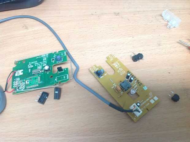 Primero desmontado los ratones para placas de circuito impreso. Estos ratones de computadora utilizan un interruptor normalmente cerrado (NC) se rompe una conexión eléctrica al presionar, así que todavía le funcionan para el ratón receptor. Puede que desee comprobaremos con un polímetro sin embargo.