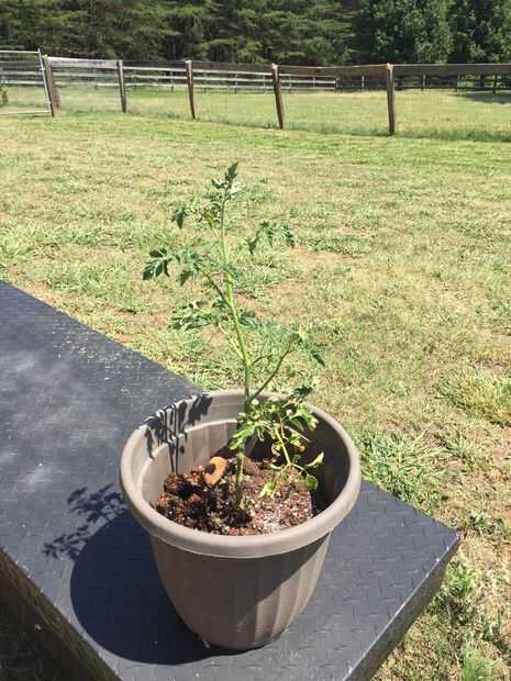 trasplante de la planta de tomate en un recipiente adecuado. Para hacer crecer la planta de tomate lo suficientemente grande para producir frutos, necesita crecer en un recipiente grande. Un balde plástico de 5 galones es ideal, pero también funciona