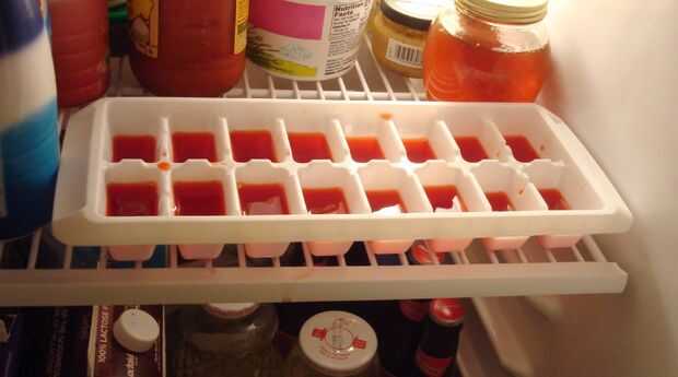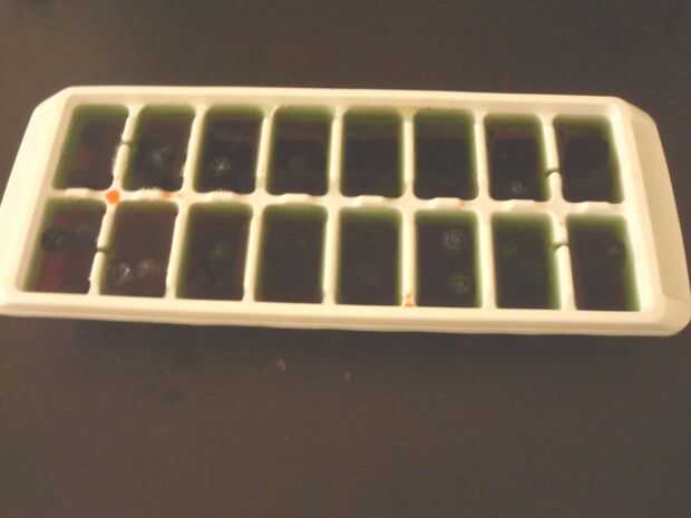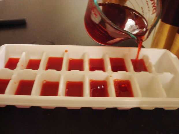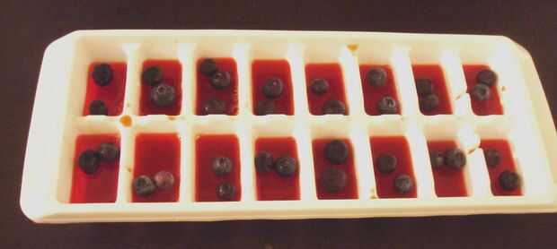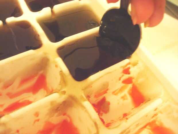 2. Vierta la mezcla en la bandeja del cubo de hielo sólo llenar los cubos 3/4 del camino, he usado gelatina frambuesa