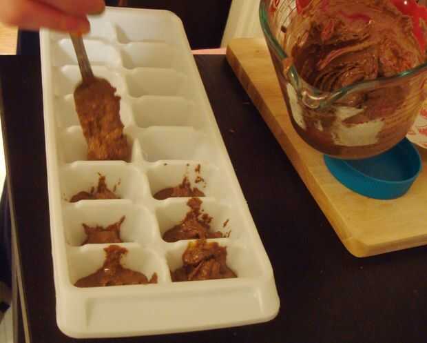 5. Utilice una cuchara para llenar los cubos de 1/3 de la forma con chocolate