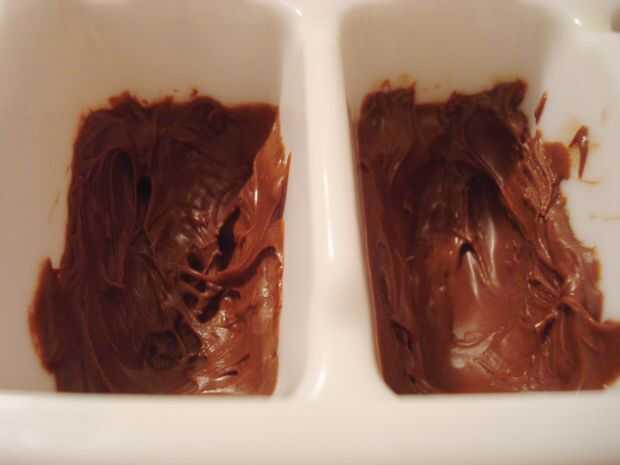 5. Utilice un pincel para pintar el chocolate en los cubos. Pintar el fondo y los lados con chocolate. Desea que la capa sea lo suficientemente espesa para no rajar, pero fina lo suficiente como para añadir un relleno