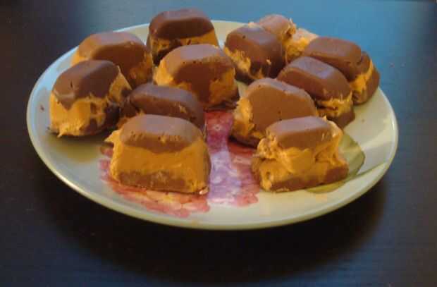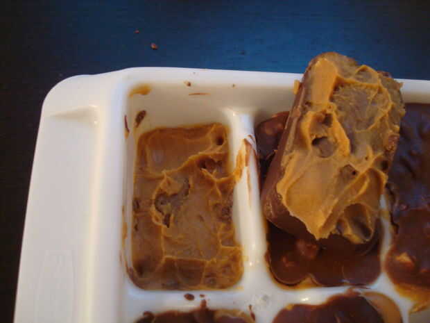 El problema con estos es que la mantequilla de maní no congelar para que cuando trataba de sacar con pala hacia fuera las dos capas de chocolate vinieron aparte. El no pasar a todos ellos y supuse que si había utilizado caramelo habría pegadas
