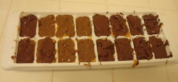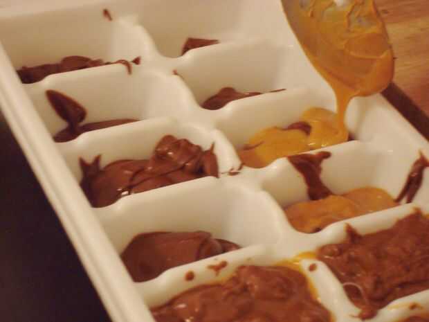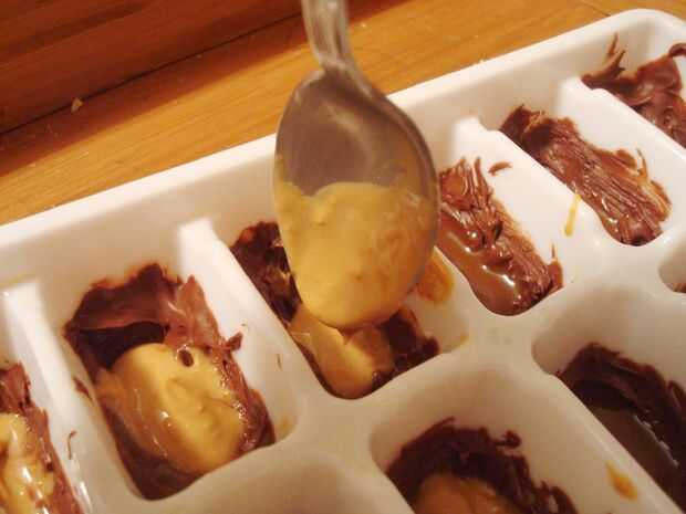6. crema de cacahuate relleno - he añadido una capa de mantequilla de maní, para hacer esta fusión la mantequilla de cacahuete en el microondas cuchara una pequeña cantidad sobre el chocolate, luego llenar los cubos en la parte superior con chocolate