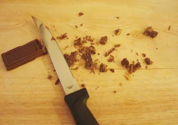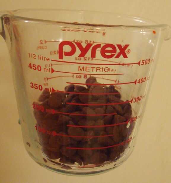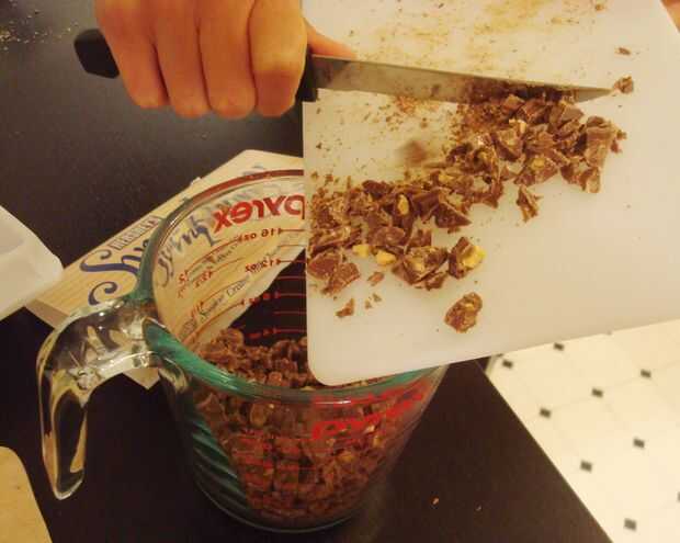 1. picar la barra de chocolate en pedazos minúsculos - utiliza una barra de chocolate con leche almendras toffy, yum. Si usa chips de chocolate no hay necesidad de picarlos.