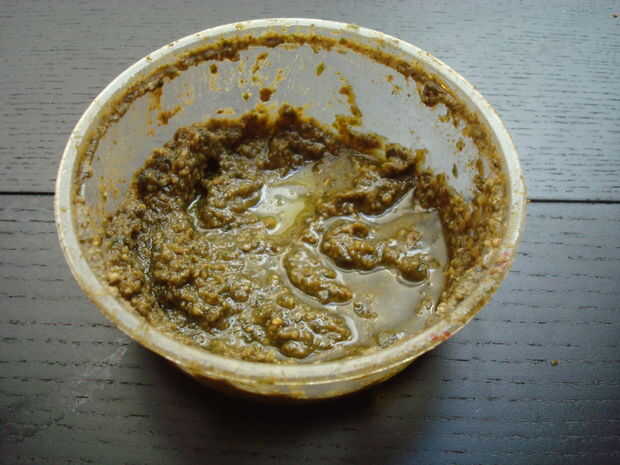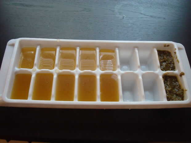 Esto funciona bien para pesto. Tenía este contenedor de pesto en mi refrigerador pero estaba tomando mucho espacio y sólo tenía pesto un poco a la izquierda por lo que congeló dos cubos del mismo y ahora mantenerlo en mi congelador un plástico mal hasta que necesite usarlo siguiente.