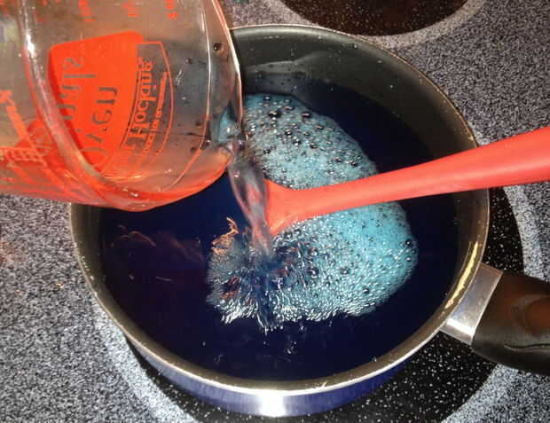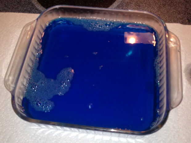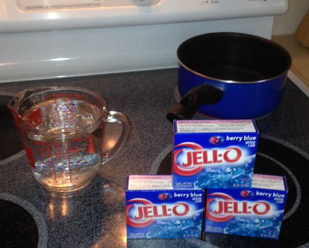 Así que normalmente, haría tres cajas de gelatina por hervir tres tazas de agua, disolver el polvo y agregar tres tazas de agua fría.