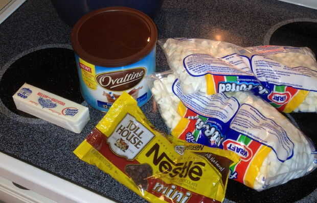 Aquí tenemos que hacer un doble lote de golosinas crujientes chocolate arroz. Hice estos de primera fundición 1 paquete de chocolate semidulce, junto con el palo la mitad de la mantequilla, antes de agregar los malvaviscos. Y luego junto con los bombones, me tiré en una taza de Ovaltine chocolate en polvo para la buena medida.