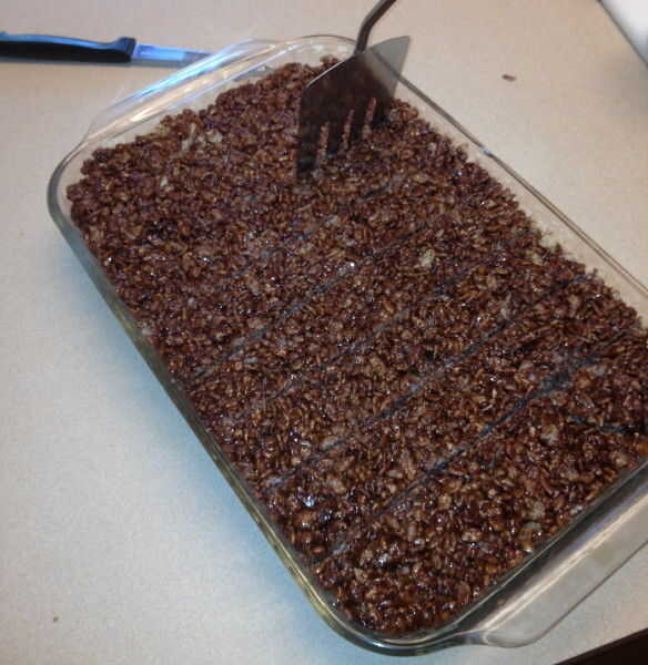 Encontré a ser mucho más difícil de cortar que la llanura que, no sé si es por el chocolate, o si presionado en la bandeja más firmemente. Pero tomó algunos persistencia real y grasa de codo. La espátula de metal era mi Salvador.